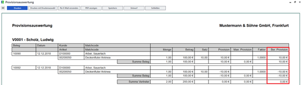 Beispiel: Wenn eine Gutschrift einen bestehenden offenen Posten ausgleicht, so wird in der Provisionsauswertung einmal der Rechnungsbeleg mit den ermittelten Provisionen positiv und auch die Gutschrift separat mit den ermittelten negativen Provisionen aufgeführt. Somit ist dann in Summe keine Provision fällig (bei Gleichheit der Beträge!).