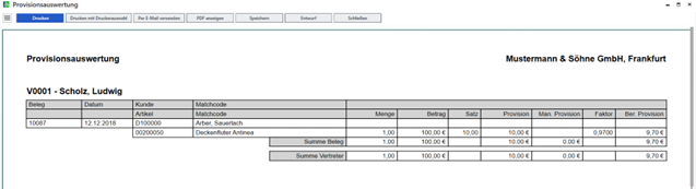 In Übersichten und anderen Masken werden Sie auf den Begriff „Faktor“ stoßen. Der Faktor ist ein grundlegendes Hilfsmittel um eine Provision errechnen zu können. Erhält der Vertreter 10 % Provision auf den Verkauf eines Artikels, so ist der Faktor ebenfalls 10 %, dargestellt als 1,0000. Sorgen Skonti dafür, dass vom Kunden nicht der gesamte, sondern nur der geminderte Artikelpreis bezahlt wird, so sorgt der Faktor dafür, dass dieser korrekt berechnet werden kann. Erhält ein Kunde z.B. 3 % Skonto, können auch nur 97 % des Artikelpreises verprovisioniert werden, d.h. der Faktor ist dann 0,97001 und mit diesem wird dann die letztendliche Provision berechnet.